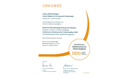 Das Diabeteszentrum am Standort Nürtingen wurde Ende des Jahres 2021 erneut von der Deutschen Diabetesgesellschaft (DDG) mit der höchsten Zertifizierungsstufe "Diabetologikum DDG" ausgezeichnet.