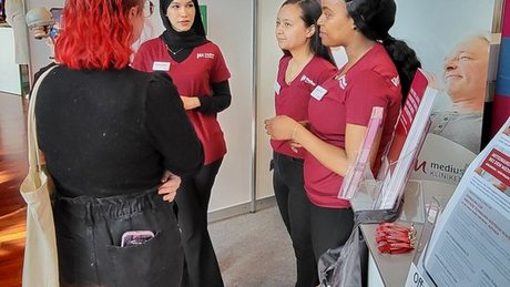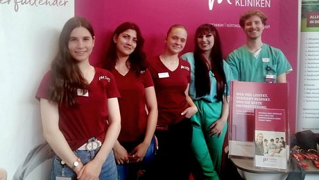 Ausgestattet mit T-Shirts im medius Look begegneten die zukünftigen Pflegefachfrauen- und männer den Besuchern freundlich und auskunftsfreudig. Selbst erst seit Oktober 2023 in der Ausbildung berichteten sie ausführlich über den Schul- und Praxisalltag, beantworteten Fragen und konnten so dazu beitragen, die Messebesucher für eine Ausbildung bei den medius KLINIKEN zu begeistern.