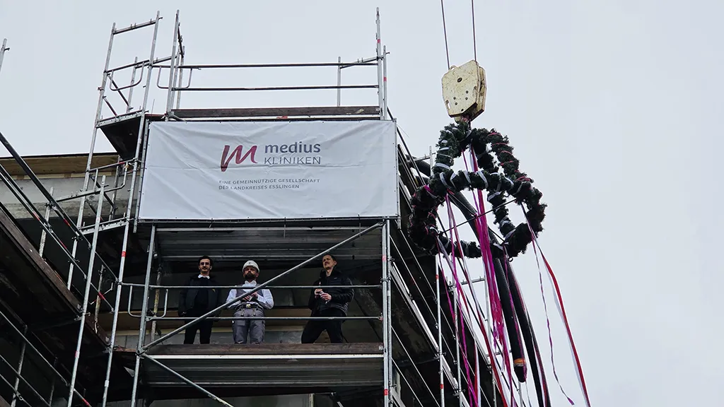 Gemeinsam mit Handwerkern, Projektbeteiligten sowie Vertreterinnen und Vertretern der Klinik wurde dieser besondere Moment gewürdigt. Dass die Richtkrone im Dauerregen emporstieg, passte beinahe sinnbildlich zu den vergangenen Monaten: Wind, Kälte und Nässe konnten dem Baufortschritt nichts anhaben. Dank des großen Engagements aller Beteiligten liegt das Bauvorhaben voll im Zeitplan. Die Fertigstellung ist für Oktober vorgesehen.