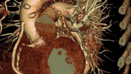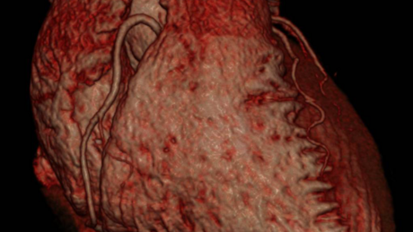 Bild 1: Dreidimensionale Darstellung des Herzens, die Herzkranzgefäße kommen unauffällig zur Darstellung