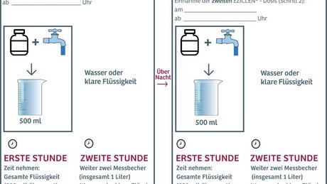 Am Tag der Untersuchung morgens bis spätestens drei Stunden vor Ihrem Untersuchungstermin 0,5 Liter Eziclen® einnehmen, bis zwei Stunden vorher zusätzlich mind. 1 Liter Flüssigkeit trinken, dann nichts mehr trinken!
